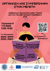 Μέθοδος: η συνάντηση θα διεξαχθεί εξ ’αποστάσεως συγχρονική μέσω πλατφόρμας Microsoft TeamsΑφίσα διαδραστικού εργαστηρίου «Οργάνωση και συμπερίληψη στην μελέτη»